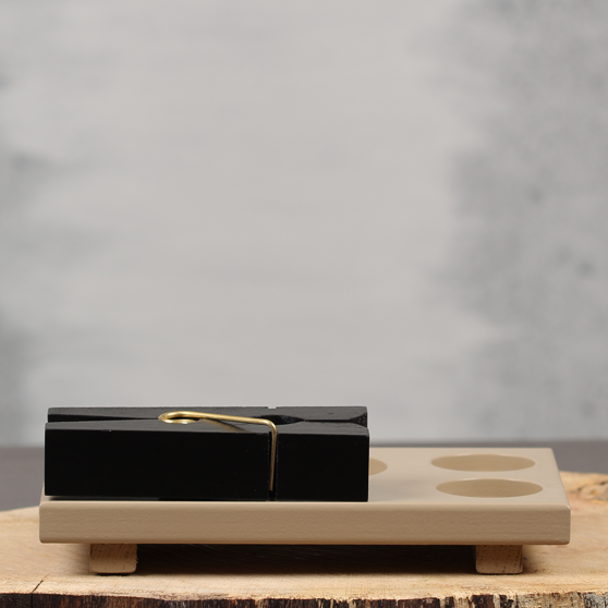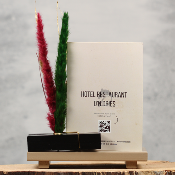 Onze grote zwarte knijper is een kaarthouder en bloemenstandaard ineen en maken we vast aan de zandkleurige tafelplank. Het enige wat jij hoeft te doen is de bijgeleverde accessoires en je peper en zout erop zetten. In slechts enkele minuten heb jij je horeca tafels compleet en smaakvol aangekleed.