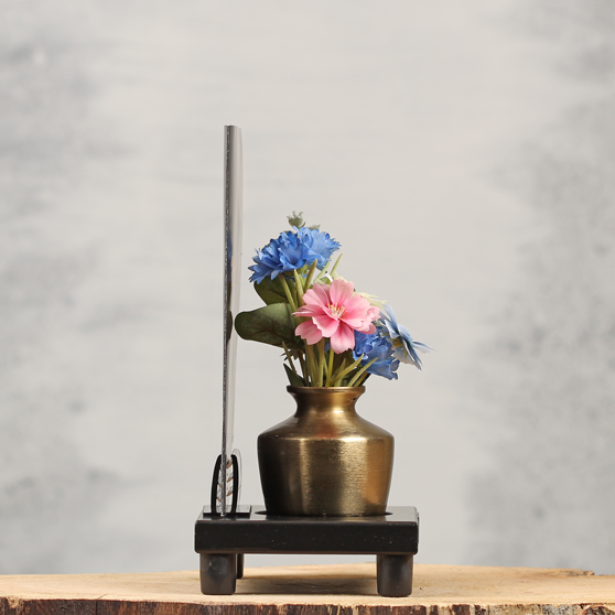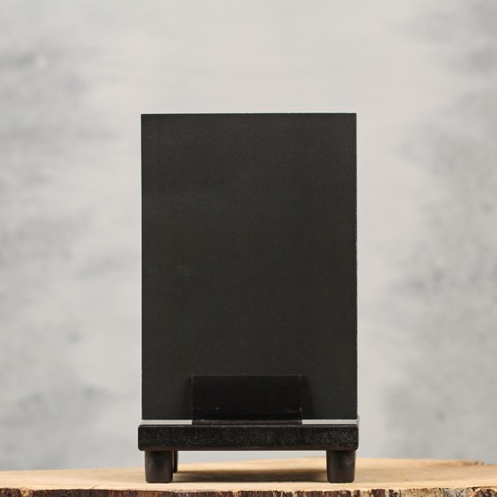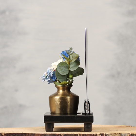 Tafelplank zwart met kaartklem, vaasje en bloemen