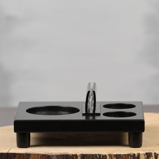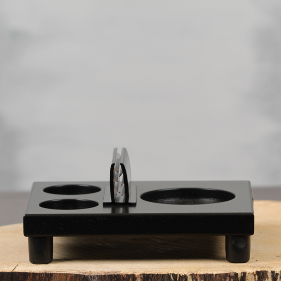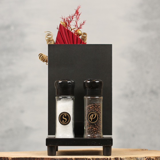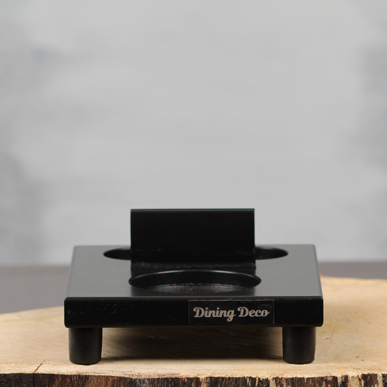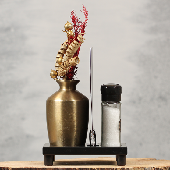 Onze sfeervolle tafeldecoratie "Grace" wordt geleverd inclusief kaarthouder en goudkleurige vaas L met kunstbloem boeket zoals je deze ziet op de foto, exclusief peper en zout. Deze compacte zwarte tafelplank met kaartklem past vrijwel op iedere horeca tafel en laat zich makkelijk optillen. Door de uitsparingen in deze compacte tafelplank blijven peper, zout en bloemenvaas altijd op dezelfde plek staan.