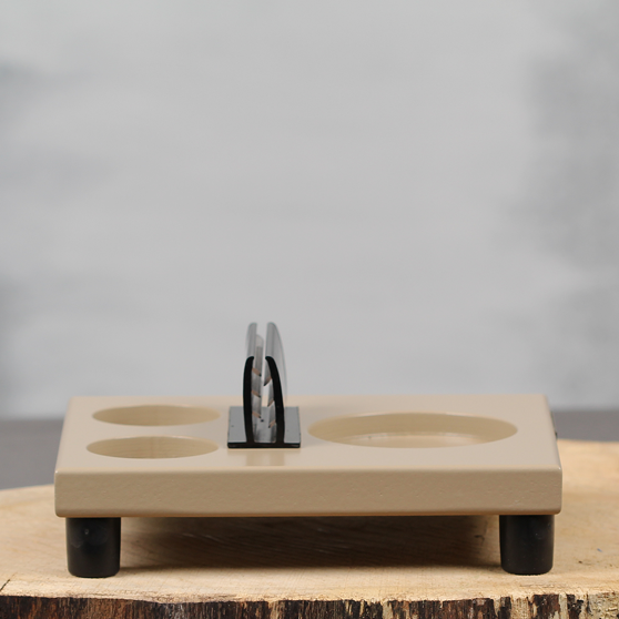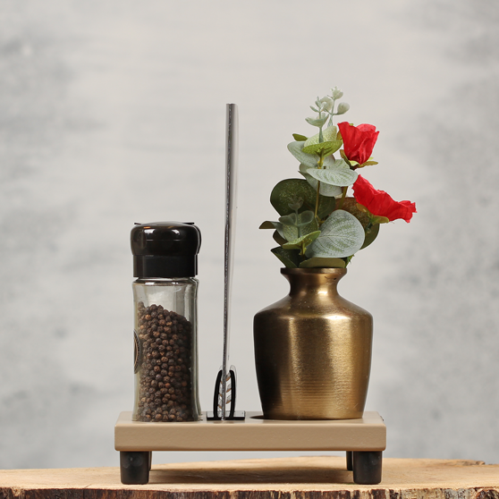 Onze sfeervolle tafeldecoratie "Maud" wordt geleverd inclusief kaarthouder en goudkleurige vaas met kunstbloem boeket zoals je deze ziet op de foto, exclusief peper en zout. Deze compacte zandkleurige tafelplank met kaartklem past vrijwel op iedere horeca tafel en laat zich makkelijk optillen. Door de uitsparingen in deze compacte tafelplank blijven peper, zout en bloemenvaas altijd op dezelfde plek staan.