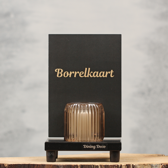 Zwarte tafelplankje met kaartklem en theelichthouder