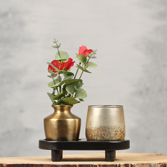 Tafelplankje met theelichthouder en bloemenvaasje